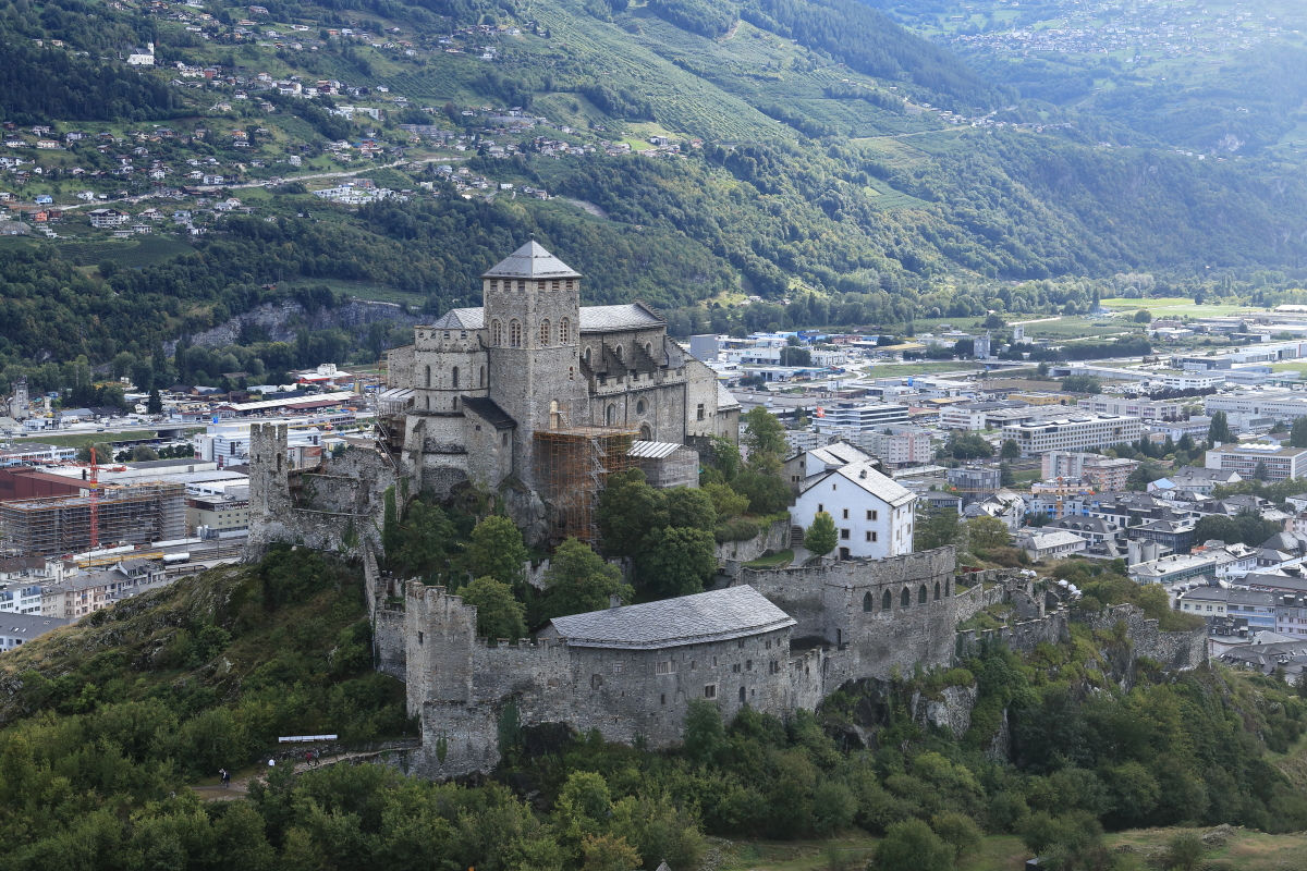 東側の尾根から望む街並み。左下のサッカー場はFCシオンのホーム、トゥルビヨンスタジアム。